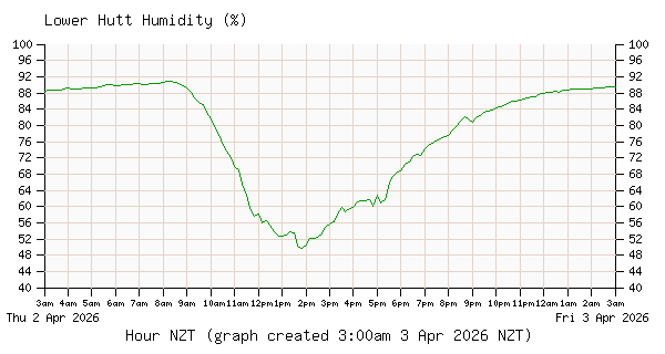 | Humidity | 89% | graph | Wind Max Gust last hour | 19 km/hr (10 kt) from NE (35°) at 00:32 Friday |